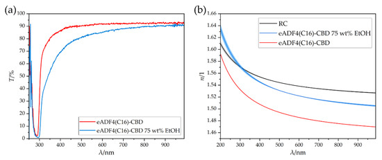 The transmission spectra of eADF4(C16)-CBD films were determined from the obtained transparent films without and with post-treatment. As can be seen in Figure 3a, both materials have an absorption band at 290 nm such as the unmodified eADF4(C16). The untreated sample had a very narrow band, which caused the transmission to increase rapidly, and attained a value of 90% at 455 nm. Subsequently, the silk reached an average transmission of 92.3%. The post-treated sample had a broader absorption band. A transmission of 90% was reached above a wavelength of 798 nm. Subsequently, the transmission increased and attained a maximum value of 92.1% at a wavelength of 951 nm. A difference to the unmodified eADF4(C16) could be seen. Due to the modification with the CBD unit, the absorption band did not decrease after post-treatment. The following slow increase in transmission was similar to that of the unmodified variant. The refractive index progressions were then determined from the transmission profile via TMM, Figure 3b.