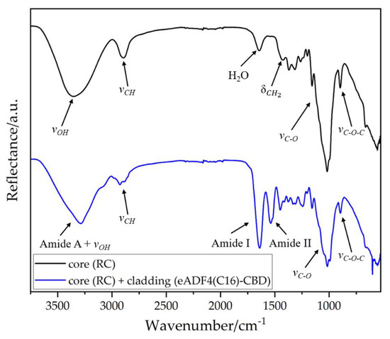 FTIR spectra of the RC core filament and the eADF4(C16)-CBD cladding layer.