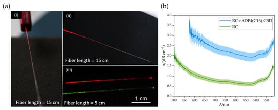 The manufactured optical fibers were then examined using a UV/VIS spectrometer. The attenuation was calculated using Equation (4). The RC-eADF4(C16)-CBD fibers could guide light of different wavelengths, Figure 6a. In (i) and (ii) it can be seen that the scattering losses occurred exclusively in the coupling region area up to a length of about 7 cm. After that, no further scattering losses were visible to the human eye. According to Equation (4), the attenuation progression could be determined as a function of the wavelength, Figure 6b.