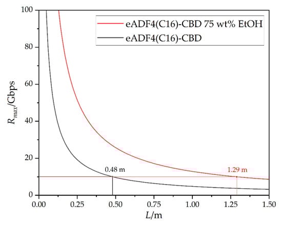 On the basis of the obtained refractive indices of the RC and the untreated and post-treated spider silk-CBD films, the NA of the respective core-cladding materials for the attenuation minimum of 878 nm could be determined using Equation (5). Afterwards, Equation (6) could be used to calculate the Δtgmax as a function of fiber length. Therefore, both the calculated NA and the vacuum speed of light of 2.9979·108 m s−1 were used. The bandwidth B could be subsequently determined as a function of fiber length using Equation (7). This resulted in the maximum data rate Rmax via Equation (8), Figure 7.