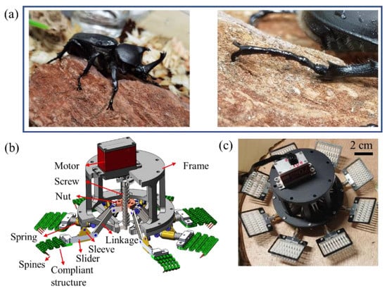 The inspiration for the microspines grippers is from the claw of the rhinoceros beetle (Coleoptera: Phileurus didymus). Figure 1a shows the rhinoceros beetle attach to the rough rock surface by its claw interlocking with the rough peak. With the adaptability of its foot joints, it can adapt to the rough wall very well. The overall scheme and real object of the microspines gripper are shown in Figure 1b,c. The opposing grasping scheme is used to achieve the attachment load in all directions. The microspines are arranged in a circular array of eight microspines boxes on a gripper, which is driven by a lead screw nut mechanism. The microspines are bonded to the flexible structure; 10 microspines form a microspine unit that is fixedly connected to the sliding rod, and the microspine unit can slide along the sleeve axis. A compression spring is arranged between the sliding rod and the sleeve to constrain the redundant degrees of freedom of the underactuated mechanism. The end of the sliding rod is connected with the link through a hinge to form a rotation pair. The link is connected to the lead screw nut through a hinge to form a rotation pair. These parts form a single gripper. The mechanical motion pair constitutes an underactuated linkage, and the other flexible structures are the passively adaptive key components of the microspines. The whole microspines is driven by only one motor, which can realize attachment and detachment at the same time.