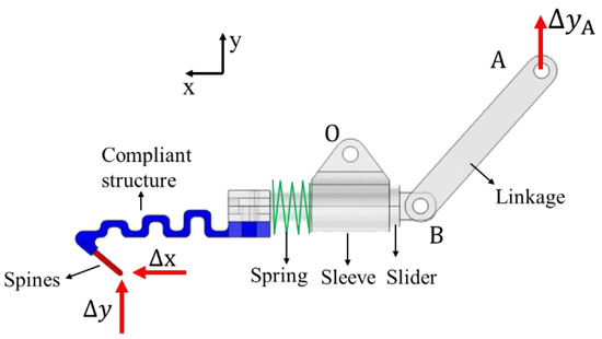 Figure 6 illustrates the process of tip moving and grasping. First, consider that the microspine tip has already contacted the micro-rough peak. By fixing the microspine tip, set an upward displacement at point A of the link to move at a uniform speed Δy = 3 mm, simulating the actuating and grasping processes. When the needle tip horizontal force Fs reaches 10 N, the tip begins to slip distance Δx and rebalance. The average spacing of rough peaks generally does not exceed 2 mm, so the constraint is 0 ≤ Δx ≤ 2 mm. Then, the grasping process is completed, and the microspines begins to bear load. The bearing process is simulated by applying the displacement Δy = 5 mm in the negative direction of the y-axis on the tip of the needle.