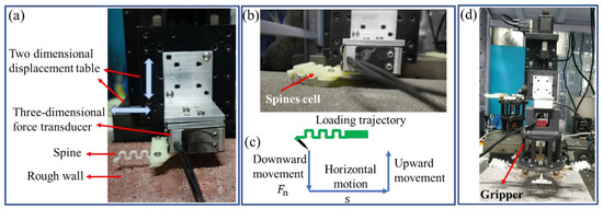 Experimental testing apparatus. (a) Attachment forces test of a spine. (b) Attachment forces test of a spine cell. (c) Loading trajectory of attachment test. (d) Attachment forces test of a gripper.