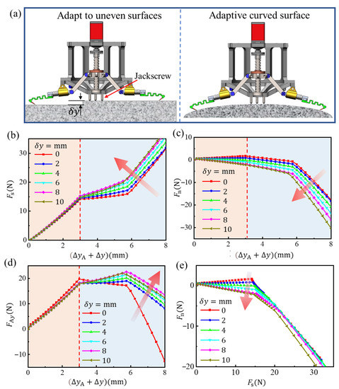 Compared with the horizontal state, the flexible structure in this state is more stressed along its axial tension, and the stiffness in this direction is greater, so the adhesive bearing capacity is stronger. Therefore, we can adjust the height of the jackscrew in Figure 8 to a proper position so that the microspine can attach in this state when grasping the plane. Further, with the increase of δy, the adhesive bearing capacity will also increase. When the microspines grasp the surface, the biggest difference is that the tangential friction between the tip and the wall also contributes to the overall adhesion. Therefore, the attachment ability of the microspines to curved objects will be enhanced to a certain extent, and the load safety line shown in Figure 8e will be inclined clockwise to the normal angle of the wall, which is widely studied in the research of gecko-like dry adhesive grippers and will not be described in depth here.