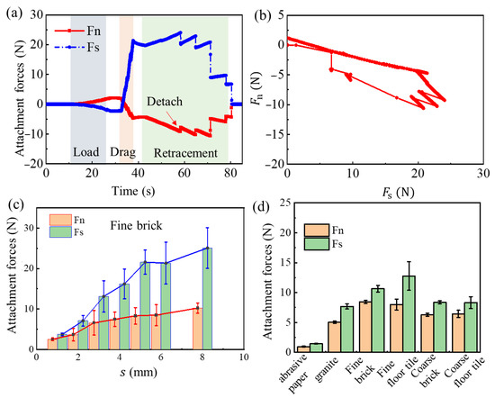 Performance of microspines Gripper. (a) Attachment forces test of the spines unit. (b) Attachment forces of the spines unit in force space. (c) The relationship between attachment forces and slip distance s. (d) Attachment forces of microspines cell on six surfaces.