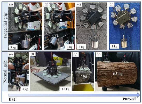 Figure 10e–h shows the performance of microspines gripper in normal adhesion. The grasping movies about granite plane, irregular rock, and tree trunk can be saw in Supplementary Material in S1, S2 and S3, respectively. It is worth mentioning that the microspines grab a deformed rock weighing 6.2 kg in Figure 10g, reflecting their centimeter-scale wall geometric adaptability. Of course, the microspines can also be used to grasp a spherical object with a rough surface. Figure 10h shows that two microspines are used to grasp a tree trunk model, and each microspines uses only four microspine elements. The weight of the trunk model is more than 6 kg, and the roughness of the bark on the surface is more than 5 mm. This grasping case reflects the extraordinary adaptability of the microspines.