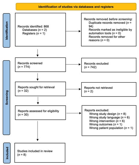 The electronic search initially identified 868 silk-related publications, which ultimately yielded 32 studies for full-text review (Figure 1). After thorough assessment and subsequent exclusion, eight studies from 2011 to 2018 were included for qualitative analysis (Table 1) [,,,,,,,,]. These consisted of two case control studies and six randomized clinical trials.