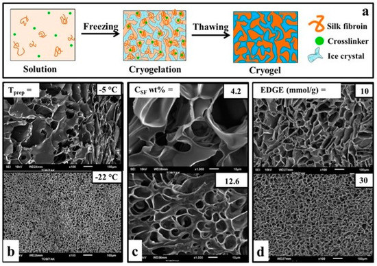 The microstructure of the cryogels, such as pore size, polymer wall thickness, and total porosity, as well as their mechanical properties, can determine their suitability for different applications [22,39]. For instance, large pore sizes provide the cryogels with shorter swelling times and enhanced viscoelasticity that does not allow for physical deformation. In addition, highly interconnected cryogels with suitable pore sizes and wall thickness allow conventional mass transport and facilitate cellular adhesion and migration if they are used as tissue-engineered scaffolds [40]. Therefore, substantial efforts have been made to control pore architecture, mechanical properties, and other important biochemical properties of silk-based cryogels. In the following sections, we compile the literature that studies the effects of cryogelation temperature, cooling rate, solution concentration, and type of crosslinking agents on the properties of silk-based cryogels.