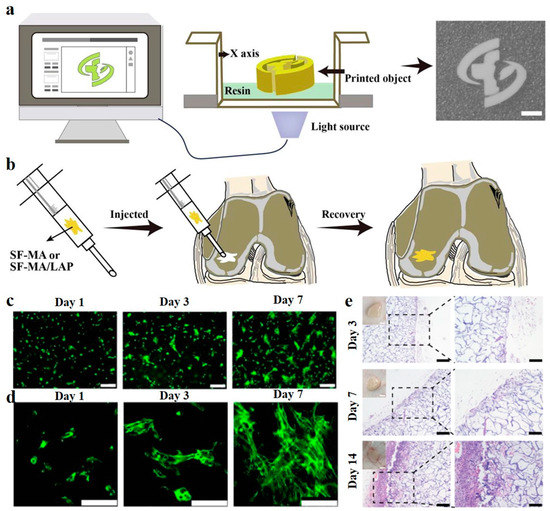 3D Cryoprinting of LAP@SF injectable cryogels for bone tissue engineering. (a) Schematic illustration of the printing process of LAP@SF cryogels. (b) The printed cryogels can recover their original shape after injection and fit the tissue defect site. (c) Fluorescence staining image of live (green)/dead (red) BMSCs, after 1, 3, and 7 days of cultivation on the printed LAP@SF cryogels. Scale bar = 200 µm. (d) The morphology of BMSCs, after 1, 3, and 7 days of cultivation on the printed LAP@SF cryogels. Scale bar = 100 µm. (e) H&E staining of the printed LAP@SF cryogel scaffold after 3, 7, and 14 days of implantation; left, scale bar = 200 µm; right, scale bar = 100 µm. Reused with some rearrangement with permission of [74] (Under a Creative Commons license: CC BY-NC-ND 4.0).