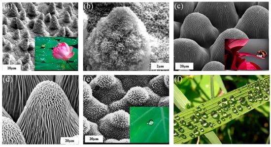 Nature exhibits outstanding evolutionary abilities [1,2,3,4]. It has developed quite diverse and complex structures. Based on its evolutionary characteristics, nature has developed optimal solutions to adapt the different life forms to their local environment. Mimicking nature helps in solving many complex problems [5,6]. The foremost example of biomimicry is probably the design of flying machines by Leonardo da Vinci inspired by birds [7]. Although there are numerous instances, one of the most exciting areas where biomimicry has made a substantial contribution is the creation of superhydrophobic surfaces [8,9]. To obtain functional characteristics such as self-cleaning, non-wettable, anti-icing surfaces, lowering drag in submarines and other vessels, and for the self-propulsion of liquids in micro-channels, superhydrophobicity is necessary [10]. In addition to low adhesion and friction characteristics offered by superhydrophobic materials, nature has also devised other modulation strategies such as SLIPS (Slippery Liquid-infused Porous Surfaces), and anti-wear surfaces for sustaining extreme tribological challenges [11]. Superhydrophobic surface designs have been influenced by the surface structure of plants and insects, such as the lotus leaf, rose petal, and water strider’s feet [12,13].