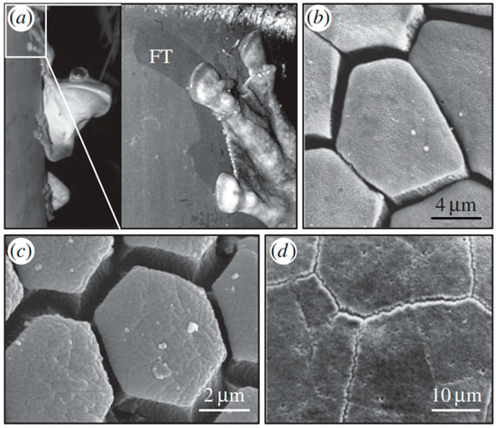 (a) On a tree trunk, a rusted tree frog. Due to the limb sliding before friction stopped the action, fluid secretion traces were left on the surface of the tree (FT), and the surface pattern was obtained in (b) tree frog, (c) bush cricket, and (d) mushroom-tongued salamander [89]. Copyright Permission 2014, Royal Society.