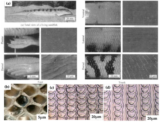 In the past decades, scientists identified the existence of life in the desert (harsh) conditions and evolved inspiration from nature, i.e., sandfish [176]. The evolution mechanism depicted that sandfish can move below the surface, revealing motion similar to swimming and dives into the sand [177]. Sandfish can swim at speed (10–30 cm/s) and move several centimeters laterally [178]. The scales over the surface of sandfish caused a reduction in the coefficient of friction (COF) [68,179]. The COF of the sandfish scale was observed to be better than PTFE particles, smooth and flat glass, steel (polished), and nylon surfaces (high density) [176,180]. As a result, the scaly texture of the sandfish hardly had any marks of wear when abrased against the sand. With a priority to reduce friction, the researcher identified that the arrangement and shape of the scale are vital in enhancing the tribological performance of the material surface [181,182]. Similarly, a group from Karlsruhe Institute of Technology mimicked two different surface textures (ball python and sandfish) on a bearing surface made of steel material and investigated tribological behavior under dry and lubricating regimes [53]. Figure 6 shows the scaling texture of sandfish and snakes. The outcomes revealed around a 40% reduction in the COF for the textured surface inspired by sandfish and a 22% reduction in the case of ball python when compared to the untextured surface. When mineral oil was used as a lubricant over the textured surfaces, three times further reduction was noticed for ball python texture and a 1.6 times reduction in sandfish texture than unlubricated condition [176]. From a future perspective, such surfaces can reduce COF in sensors embedded with lock brake systems (car), artificial hips, computer hardware, and machines running in a vacuum environment. It follows that the surface morphology of sandfish and snakes (ball pythons) are beneficial for research advancements in the field of tribology [53,176]. Considering the surface morphology of snake scales (hexagonal scales), the self-lubricating surface geometry acts as a prudent surface in creating a low-friction regime.