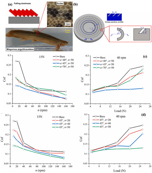 (a) loach’s scales are stacked up like falling dominoes, (b) geometrical characteristics of a bionic scaly texture and bionic scaly textures placed on a disc, (c,d) coefficient of friction was analyzed on the textured surface at different angles and different circumferential directions at a time, compared with the bare specimen [193]. Copyright permission from Elsevier, 2022.