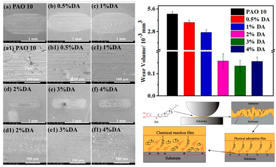 SEM morphology of wear-out sample with different compositions of DA in PAO 10 along with the critical value of wear rate. The 3% of DA in PAO 10 is the optimum/ideal value in terms of reduced friction and anti-wear surface [201]. Copyright permission from Elsevier, 2022.