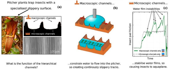 (a) Bioinspired pitcher plant surface paving the way for slippery surface, highlighting the micro- and macroscopic channels over the surfaces, (b) macroscopic channels allowing the flow of water into the pitcher plant, providing a slippery pathway, and (c) microscopic channels stabilizing water films and trapping insects [286]. Copyright permission from Elsevier, 2021.