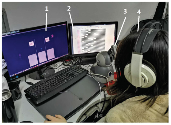 Experimental platform. 1: Compliance rendering scene based on Openhaptic SDK. 2: MATLAB GUI for data record. 3: Haptic interaction device. 4: The participant.