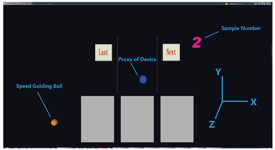 Each rendering sample present to the subject has its corresponding levels of stiffness, damping and exploration speed, so there are a total of 27 samples in this paper. As shown in Figure 1 and Figure 2, the stimuli of compliance were presented in the gray blocks in the lower part of the screen. The blue ball is the proxy of the haptic rendering device in the virtual environment. When participants moved the Geomagic Touch probe up and down in the real world, the proxy would move up and down (along the Y axis) correspondingly. When the blue ball moved into the gray blocks, participants would feel the specific feedback generated by the device according to the preset stiffness and damping coefficient levels. It is worth noting that, all the blocks would not have a visual deformation throughout the experiments to avoid the influence of visual channel on haptic feelings. The levels of the exploration speed of participants were controlled by speed guiding through the orange ball. The orange speed guiding ball would move up and down at a constant speed (one of the 3 speed levels) and the participants were asked to move the proxy on the screen following it at a speed as close as to the orange one.
