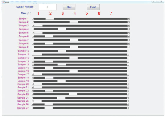 MATLAB data collection GUI for the pilot experiment. Sliders in the same column indicating their corresponding samples are classified into the same group.