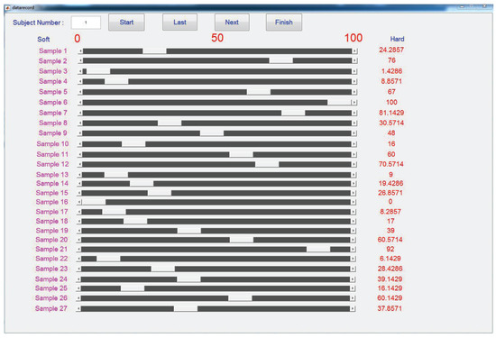 In the main experiment, the participants were asked to complete the adjective rating. They had to rate all 27 samples focusing on the feelings described by each adjective label selected from the pilot experiment. As shown in Figure 4, the adjective labels such as hardness and stickiness that needed to be focused on by the participant would be displayed on the GUI. There were five adjective labels to be rated in this paper according to the results of the pilot experiment, which would be shown in the next section. Each sample had its corresponding slider range from 0 to 100, and the 0 meant the present sample had a minimum perceptual intensity and 100 meant that the present sample had a maximum perceptual intensity to the present adjective label among all the samples. Before rating each adjective label, the participants needed to go through all the samples and select the samples that had the minimum and maximum perceptual intensity, respectively, as scoring references, which would be displayed in the left and right gray blocks throughout the experiment. When the experiment started, the participants perceived the test samples displayed in the middle gray block and were asked to rate the feelings compared with the references along the present adjective label to be focused on. The participants were allowed to revisit all the samples before modifying or confirming their results as many times as required. When the ratings of all samples were completed, the participants could click the next button and repeat the above steps to rate the samples for the next adjective label.