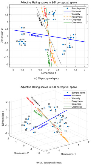 In order to show more details of the relations between the parameter change and the distribution of the samples, average ratings of each adjective label were projected into the 2D and 3D perceptual spaces as vectors. The directions of the vectors were determined by the standardized regression coefficients [42,43] shown in Table 3 and Table 4, whilst regression coefficients with different dimensions were the direction vectors of each adjective label line. The coefficients were obtained by the multiple linear regression method with the 2D and 3D sample point coordinates as the independent variables and the adjective label ratings as the dependent variables. The standardized regression coefficients were used in the process because the sums of the squares of the standardized regression coefficients are basically proportional to the variance of the adjective scales “captured” by the MDS space [42]. The values of the determination coefficients () of all adjective labels were higher than 0.94, which means that the regression fits the data perfectly. The projection of the adjective ratings in the 2D and 3D spaces are shown in Figure 7. As seen in the figure, each adjective rating was projected as a straight line through the origin. Directions of the lines show the perceptual intensity of the corresponding adjective labels. For example, the blue line represents the adjective label of hardness. Hardness decreases from left to right and the directions are marked as + and − on the line. Other adjective labels (viscosity, roughness, crispness and cleanness) were drawn in the 2D and 3D spaces in the same way. Therefore, in the 2D perceptual space, as shown in Figure 6a, samples distributed in the left part have greater perceptual hardness and samples in the right part have smaller perceptual hardness, while samples in the upper part have greater perceptual viscosity, roughness and cleanness and samples in the lower part have smaller perceptual viscosity, roughness and cleanness. Samples in the upper left part have greater perceptual crispness and samples on the lower right part of the space have smaller perceptual crispness. The distribution regularities of these samples are the same as in the 3D MDS space as shown in Figure 6b, which are not repeatedly described in detail here.