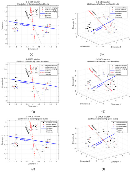 As shown in Figure 8e,f, the different colors of sample points stand for the different levels of exploration speeds, black for the maximal exploration speed value, blue for the minimum exploration speed value and red for the medium exploration speed value. However, there is no similar regular pattern as there is for stiffness and damping here because the distribution of the colors seems to be irregular in both the 2D and 3D perceptual spaces. This means that the exploration speed has no significant effect on the perception of perceptual hardness, crispness and viscosity, which also corresponds with the regression analysis results: all the p values of the five adjective labels for the exploration speed is larger than 0.01.