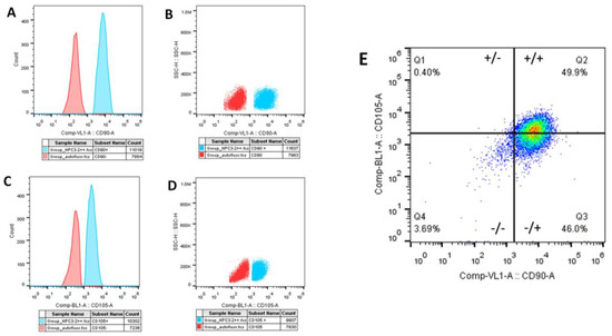 Flow cytometric characterization of hDPSCs. hDPSCs (90% confluence, 4 PDL) were cultivated for 48 h. (A,B). The population of cells labeled with the antibody anti-CD90 was 60% positive (C,D), and the population labeled with the anti-CD105 antibody was 59% positive. In orange, the population of negative cells (autofluorescence) and in blue, the positive cells. (E) Population of double-positive cells for CD105 and CD90, corresponding to 49.9% positive. Antibody used anti-human-CD90 superbright 436 and anti-human-CD105 Alexa Fluor. hDPSCs = human dental pulp stem cells; PDL = population doubling level.