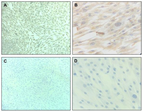 Immunohistochemistry characterization of hDPSC primary culture. hDPSCs (90% confluence, 4 PDL) were cultivated for 48 h. Microphotographs (A,B) show strong, positive vimentin, and (C,D) show negative for CD34, at 20× and 40×, respectively. hDPSCs = human dental pulp stem cells; PDL = population doubling level.
