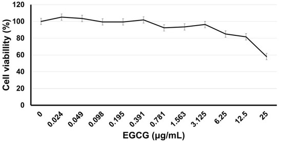 The hDPSCs were subcultured (4 PDL) in a 96-microwell plate. Cells were washed with PBS (–) and detached by 0.25% trypsin–0.025% EDTA-2Na in PBS (–) (Sigma-Aldrich) for each experiment. The number of inoculated cells was determined by excluding trypan blue with a hemocytometer under light microscopy. A total of 1 x105 cells/mL were subcultured for 48 h to allow complete attachment. The cells were treated with EGCG (Sigma-Aldrich, 0–25 µg/mL, n = 9), then incubated for 24 h with fresh culture medium. The cell viability was determined by the MTT method. In brief, cells were incubated for 7 h with 0.2 mg/mL (Thiazolyl Blue Tetrazolium Bromide, Sigma-Aldrich) in fresh MEM with 10% FBS. The formazan formed during incubation was dissolved with 0.1 mL of dimethyl sulfoxide (DMSO, Karal, Mexico). The absorbance at 570 nm of the lysate was determined by using a microplate spectrophotometer reader (Multiskan go, Thermo-Scientific, Helsinki, Finland). The cytotoxicity was based on the ISO 10993-5:2009 Biological evaluation of medical devices—Part 5: Tests for in vitro cytotoxicity.
