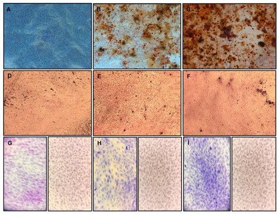 Figure 4 shows the alizarin red, Von Kossa, and collagen (Masson trichrome stain)/vimentin immunochemistry. In the control group, in which conventional growth media was used (Figure 4A,D,G and Figure 5), no mineral deposited on the cell surface was observed, and only a minimal amount of collagen/vimentin was present.