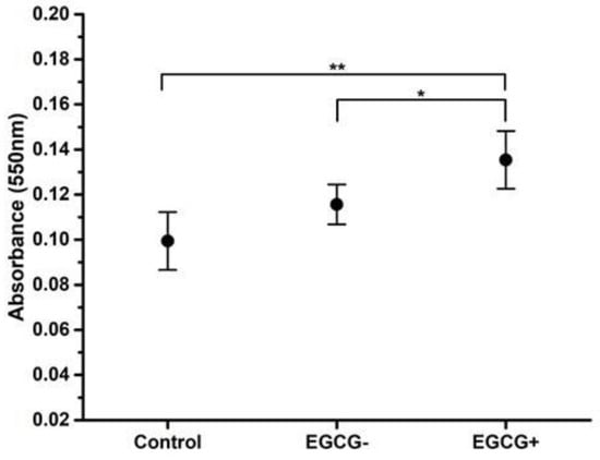 To perform the broth microdilution assays, three certified bacterial strains were used: Escherichia coli (ATCC 8739), Streptococcus mutans (ATCC 36668), and Staphylococcus aureus (ATCC 6538). For the broth microdilution assay, the Mueller Hinton growth medium (Sigma-Aldrich) was prepared per the manufacturer’s instructions. Then, the bacteria were placed on Mueller Hinton agar plates (Mueller Hinton BD Bioxon, Mexico) and kept at 37 °C for 24 h for incubation. The same methodology was followed with each bacterium. Briefly, 6 homogeneous colonies were placed in 15 mL of Mueller Hinton broth; this suspension was incubated for 24 h at 37 °C. The bacteria were cultivated at 0.5 on the McFarland scale (Containing about 1 × 108 (CFU)/mL), then 30 µL was used to prepare a working solution at a final dilution of 1:1000. The EGCG was inoculated at different concentrations from 0 to 4 µg/mL and incubated for a further 24 h at 37 °C. The number of surviving bacteria was determined by 0.2 mg/mL of MTT (Thiazolyl Blue Tetrazolium Bromide, Sigma-Aldrich), which was incubated in the dark for 4 h at room temperature. The microplate was analyzed with a microplate spectrophotometer reader (Thermo-Scientific) at 595 nm. For the internal validity design, the sterile saline solution was used as the negative control, with 0.12% chlorhexidine hydrate (Dentscare Ltd.a, FGM, Brazil) as the positive control. Assays were performed in triplicate from three independent experiments (n = 9). The data were analyzed following the Clinical and Laboratory Standards Institute (CLSI).