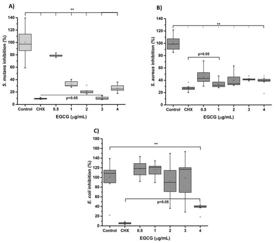 Figure 6 corresponds to the results obtained in the antimicrobial tests using EGCG through microdilution in broth. Streptococcus mutans, Staphylococcus aureus (Gram-positive type, facultative anaerobe), and Escherichia coli (Gram-negative bacillus, facultative anaerobe). The results show that EGCG influences growth inhibition significantly compared to the control group (chlorhexidine 0.12%). The bacteria with the highest susceptibility to EGCG were Streptococcus mutans < Staphylococcus aureus < Escherichia coli. Regarding the effect of EGCG on Streptococcus mutans, there was a nonsignificant (p > 0.05%) effect with respect to chlorhexidine at the concentration of EGCG 3.12 µg/mL, with an MIC of 1 µg/mL, being highly sensitive. In the case of Staphylococcus aureus, there was a nonsignificant difference at the 0.5% concentration, with an MIC of 1 µg/mL. It was similarly sensitive. The results showed that the bacterium with the greatest resistance was Escherichia coli since the inhibitory effect of EGCG was reached at the maximum concentration (4 µg/mL), with an MIC at the same concentration. It might be thought that from the data obtained, the effect on growth inhibition could be dose-dependent. Finally, Streptococcus mutans exhibited the highest susceptibility to EGCG (MIC50, 0.5–1 µg/mL and MIC90, 1–2 µg/mL) Staphylococcus aureus and Escherichia coli (MIC50, 1–3 µg/mL and MIC90, 2–4 µg/mL).