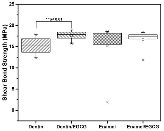 EGCG remineralization and shear bond strength (SBS). The enamel and dentin were demineralized with a solution containing 1.5 mM of CaCl2, 0.9 mM of KH2PO4, 150 mM of KCl, and 0.1 mM of sodium acetate at pH 4.5 for 360 h at 37 °C with 180 rpm. Standardized resin blocks of 4 × 4 × 1 mm adhered to enamel and dentin as follows: Group 1: dentin SBS; Group 2: dentin SBS with EGCG 3.12 µg/mL, Group 3: enamel SBS; Group 4: enamel SBS with EGCG 3.12 µg/mL. After 2 days in distilled water at 37 °C, the SBS was performed at a cross speed of 1 mm/min. Each value represents the mean ± SD megapascals (MPa) of n = 10, ** p < 0.01 ANOVA post hoc Tukey test. EGCG = (-)-Epigallocatechin-Gallate; SD = standard deviation.