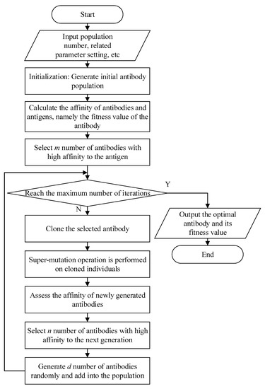 For the convenience of model design, the principle of the biological immune system is simplified. All substances that do not belong to themselves are regarded as antigens. When the immune system is stimulated by antigens, antibodies will be produced to bind to antigens specifically. The stronger the association between antigen and antibody, the higher the affinity. Then, the antibodies with high antigen affinity are selected to multiply and differentiate between binding to the antigens, increase their antigen affinity through super-mutation, and finally eliminate the antigens. In addition, some of the antibodies are converted into memory cells in order to respond quickly to the same or similar antigens in the future. In the CSA, the problem that needs to be solved is regarded as the antigen, and the solution to the problem is regarded as the antibody. At the same time, the receptor-editing mechanism is adopted to avoid falling into the local optimum. The flow chart of CSA is shown in Figure 2.