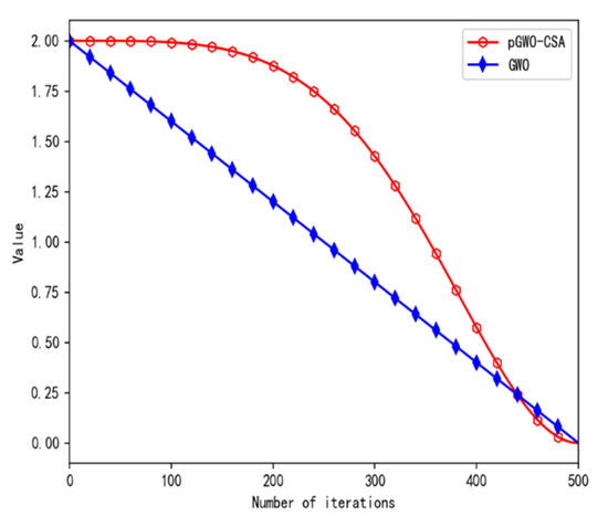 Iterative curves of parameter in the original GWO and pGWO-CSA are shown in Figure 3.