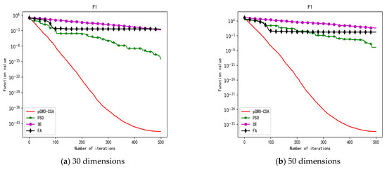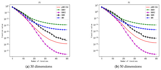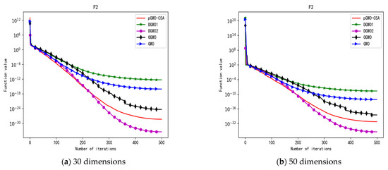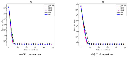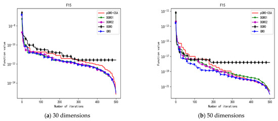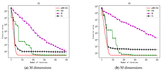 In 50 dimensions, the test results of these five algorithms on test function F1–F15 are shown in Table 7. The convergence curves of these five algorithms on test function F1–F15 are recorded in Figure 20b, Figure 21b, Figure 22b, Figure 23b, Figure 24b, Figure 25b, Figure 26b, Figure 27b, Figure 28b, Figure 29b, Figure 30b, Figure 31b, Figure 32b, Figure 33b and Figure 34b.