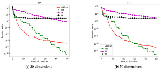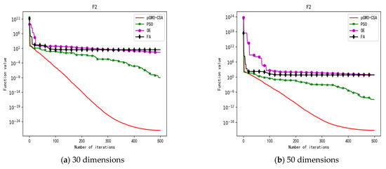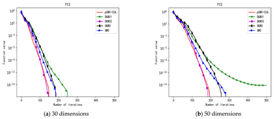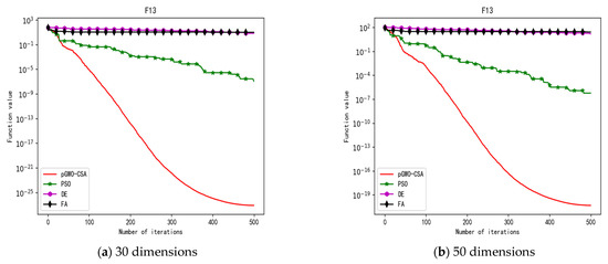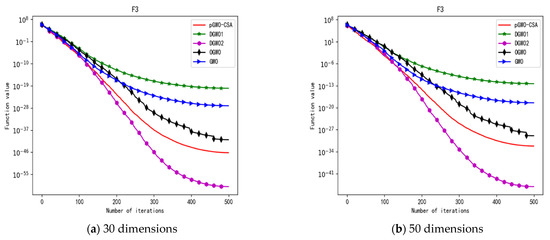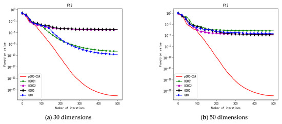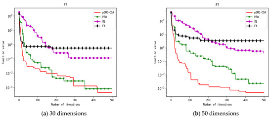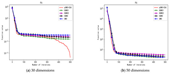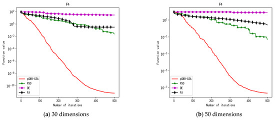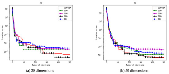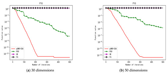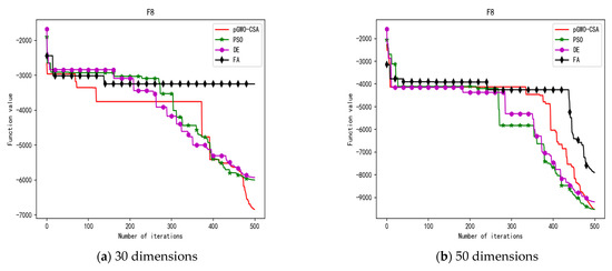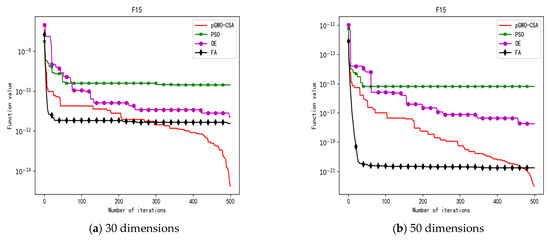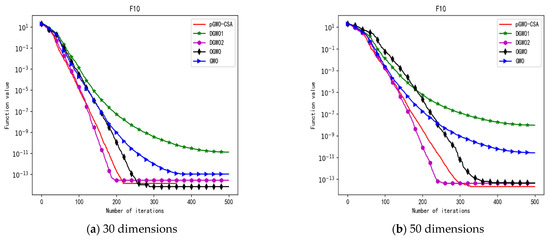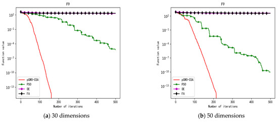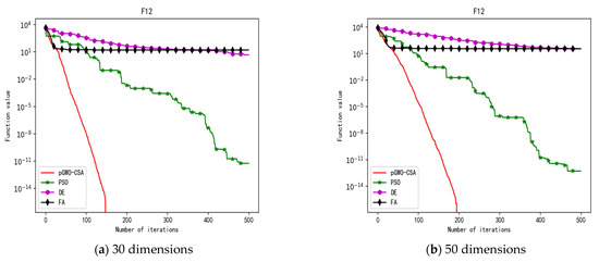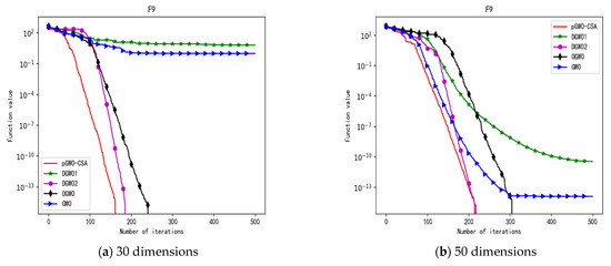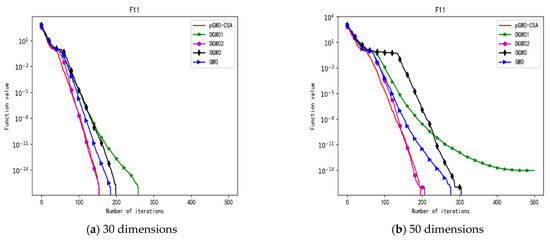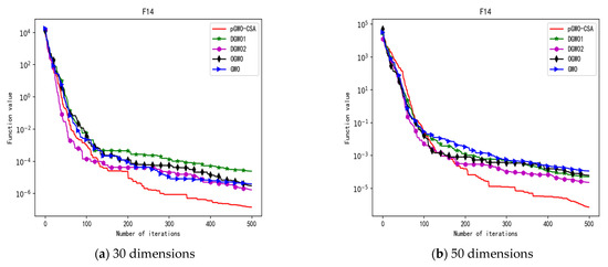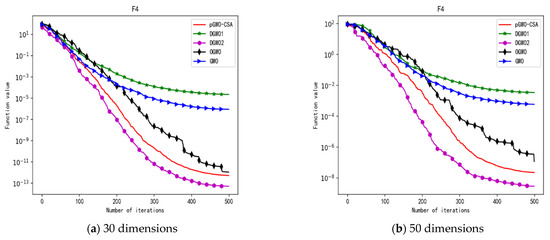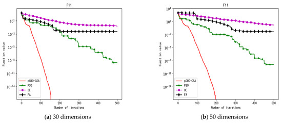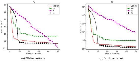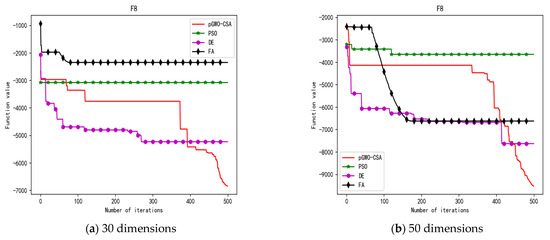 By comparison, it is not difficult to find that pGWO-CSA performs better than the previous seven test functions, F1–F7, in the following eight test functions, F8–F15, whether in the 30 dimensions or the 50 dimensions. It can be seen that pGWO-CSA performs better in more complex functions, which is largely due to the super-mutation operation carried out by pGWO-CSA, which helps pGWO-CSA better jump out of local optimum.