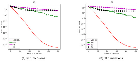 In 30 dimensions, the test results of these four algorithms on test function F1–F15 are shown in Table 3. The convergence curves of these four algorithms on test function F1–F15 are recorded in Figure 5a, Figure 6a, Figure 7a, Figure 8a, Figure 9a, Figure 10a, Figure 11a, Figure 12a, Figure 13a, Figure 14a, Figure 15a, Figure 16a, Figure 17a, Figure 18a and Figure 19a.