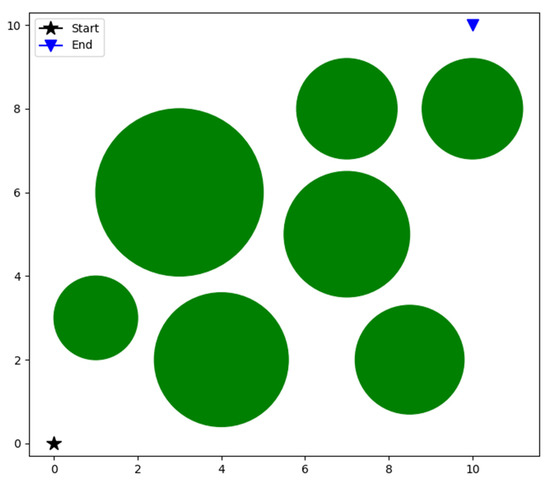The environment model of the robot path-planning problem is shown in Figure 35. The starting point is located at (0,0) and marked with a black star, the endpoint is located at (10,10) and marked with a blue triangle, and the obstacles are marked with a green circle. The mathematical expression of the obstacles is shown in Formula (13).