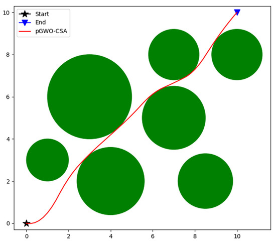 In order to verify the applicability and superiority of pGWO-CSA in robot path-planning problems, PSO, DE, FA, GWO, and its variants are compared with pGWO-CSA. The parameters of all algorithms are exactly the same as in Section 4. In order to avoid the randomness of the algorithm, each algorithm will be run 10 times, and then the minimum, maximum, and mean of the results will be recorded. The path planned by pGWO-CSA is shown in Figure 36, and the experimental results of all algorithms are shown in Table 9.