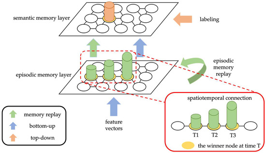 The mechanism of the semantic memory layer is similar to the episodic memory layer but with additional constraints for creating new nodes in the network. Learning of nodes in the network occurs when the network correctly predicts the class of the input labeled from the episodic memory layer at training time. If the predicted class is incorrect, a new node is generated. This additional condition suppresses the update rate of the nodes in the semantic memory layer. Furthermore, because of the hierarchical learning of input data, the nodes in the semantic memory layer can store knowledge for longer than those in the episodic memory layer. The semantic memory layer determines the best winner node based on Equations (12) and (13), using the best winner node of the episodic memory layer as input.
