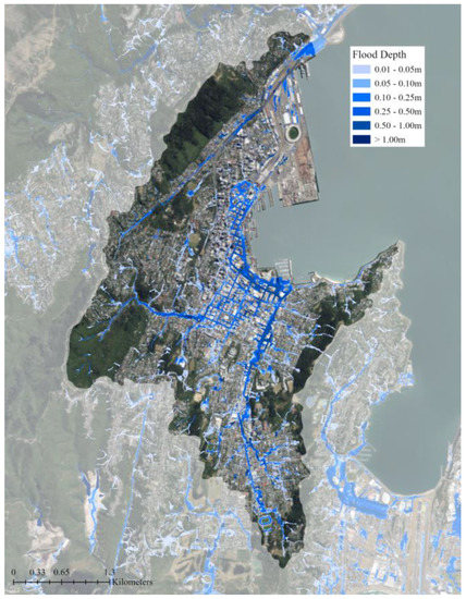 Flooding areas and depths in the Lambton Harbour-Oriental Bay catchment for a 1-in-100-year flooding event, taking into account climate change (assuming a 2.1 °C temperature increase) [42]. The worst flooding is predominately located along the coast and on major transportation arteries. The base aerial imagery was sourced from the LINZ Data Service [43].