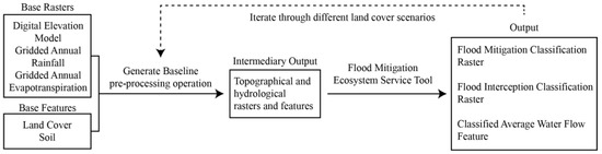 Nature Braid workflow. First, base raster and feature data were collated in GIS. The generate baseline pre-processing operation was run to generate intermediary topographical and hydrological data. These intermediary outputs were then used to run the individual ecosystem services tool for flood mitigation. The flood mitigation ecosystem service tool generated flood mitigation classification, flood interception classification, and average waterflow data, which can be used to inform future iterations of land use scenarios [51].