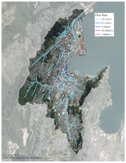 The average water flow class output from the flood mitigation tool. The blue lines show major overland stormwater flow paths and flow rates (m3/s). The base aerial imagery was sourced from the LINZ Data Service [43].