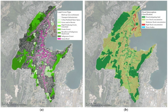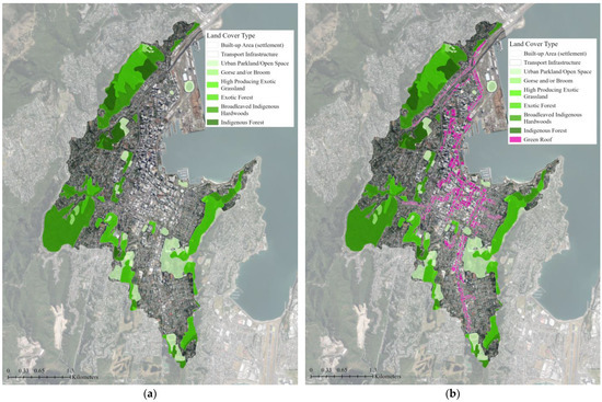 Land cover classification maps for: (a) The existing green infrastructure network; (b) The proposed green infrastructure network with supplemental green roofs. The base aerial imagery was sourced from the LINZ Data Service [43].