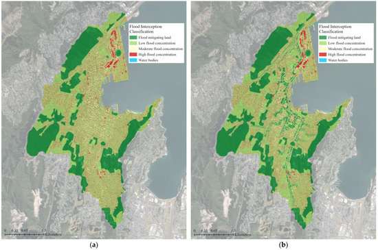 Nature Braid flood interception classification map for: (a) The existing green infrastructure network; (b) The proposed green infrastructure network with supplemental green roofs. Flood-mitigating land, such as green spaces and green roofs, is shown in dark green. Areas that most benefit from these features and have low flood concentrations are shown in pale green. Areas with moderate flood concentrations are shown in yellow, and high flood concentration areas are shown in red. These areas are the ones that could most benefit from features to improve water storage and slowing capacities to reduce flooding. The base aerial imagery was sourced from the LINZ Data Service [43].