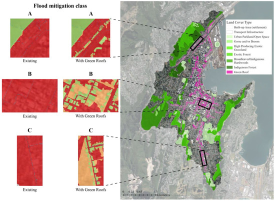 Optimising green roof locations for flood mitigation. Red represents non-mitigated features, orange represents mitigated features, and green represents mitigating features in the flood mitigation class maps. The small-scale, linear green roofs in area A do not provide as much flood mitigation as the larger, more clustered green roofs in areas B and C. This indicates that the location, size, and configuration of green roofs (mitigating features) impact how beneficial they are to stormwater management beyond their sites. The base aerial imagery was sourced from the LINZ Data Service [43].