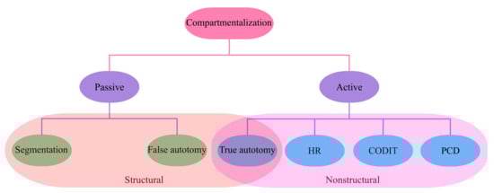 Classification of different natural compartmentalization phenomena. HR, CODIT, and PCD stand for hypersensitive response, Compartmentalization of decay (damage) in trees, and programmed cell death, respectively.