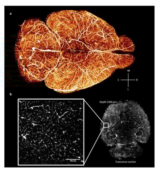 Whole mouse brain vasculature tomography; (a) 3D rendering and (b) single frame from a stack at original resolution, as reported in [57], (with no modification under Creative Commons 4.0 license (https://creativecommons.org/licenses/by/4.0/, accessed on 2 February 2023)).