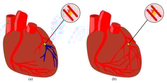 Schematic drawing of the coronary artery circulation (a) without and (b) with collateral circulation, based on the concept reported in [65].