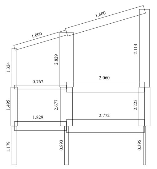 Following biological insights, two possible trends emerge. On one side, there are structural designs that foster some specific types of damage tolerance and try to uniform the response of the system to the threat: this is the case, for example, of those schemes in which the structural complexity with a defined loading scheme is maximized [66]. As an example, Figure 7 illustrates a frame structure subjected to vertical and lateral loads (equal magnitude) on nodes. The size of the elements ensures maximization of the normalized structural complexity index (NSCI) of the system; hence, the effects of a local element removal are similar wherever the location of the damage [67]. Nevertheless, it is theoretically possible to fully implement the natural strategies for ALP on future smart structures, i.e., structures that are able to modify their stiffness, connections, and constraints depending on the load types and intensity acting on them.